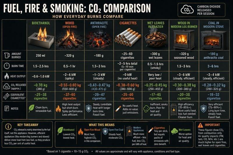 In a nutshell, if you need to burn something to keep warm then modern burners release the least amount of carbon back into the atmosphere and wood burnt on an open fire or garden fire pit releases the most. Almost the same amount as 3 people smoking 20 cigarettes.